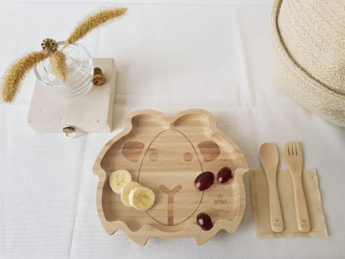 Het bordje heeft de vorm van een leeuwen hoofd en is gemaakt van bamboe, onder het bordje zit een rubberen rand waarmee je het bordje vacuum kan zuigen aan de tafel en dan vallen de bordje gelukkig niet op de grond 😉