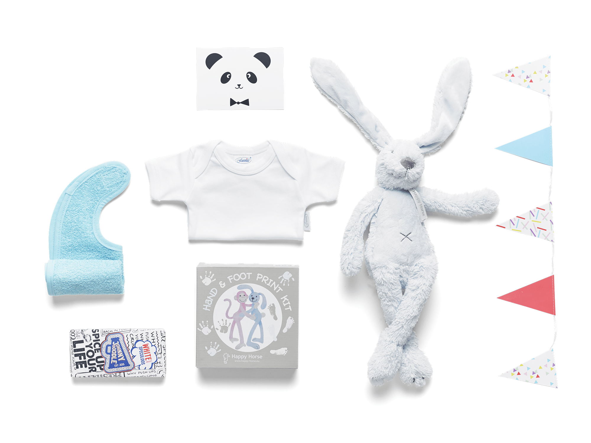 Samen met de best selling blauwe Rabbit Richie van Happy Horse en een basic romper en slabber maakt dit een prachtig kraamcadeau!