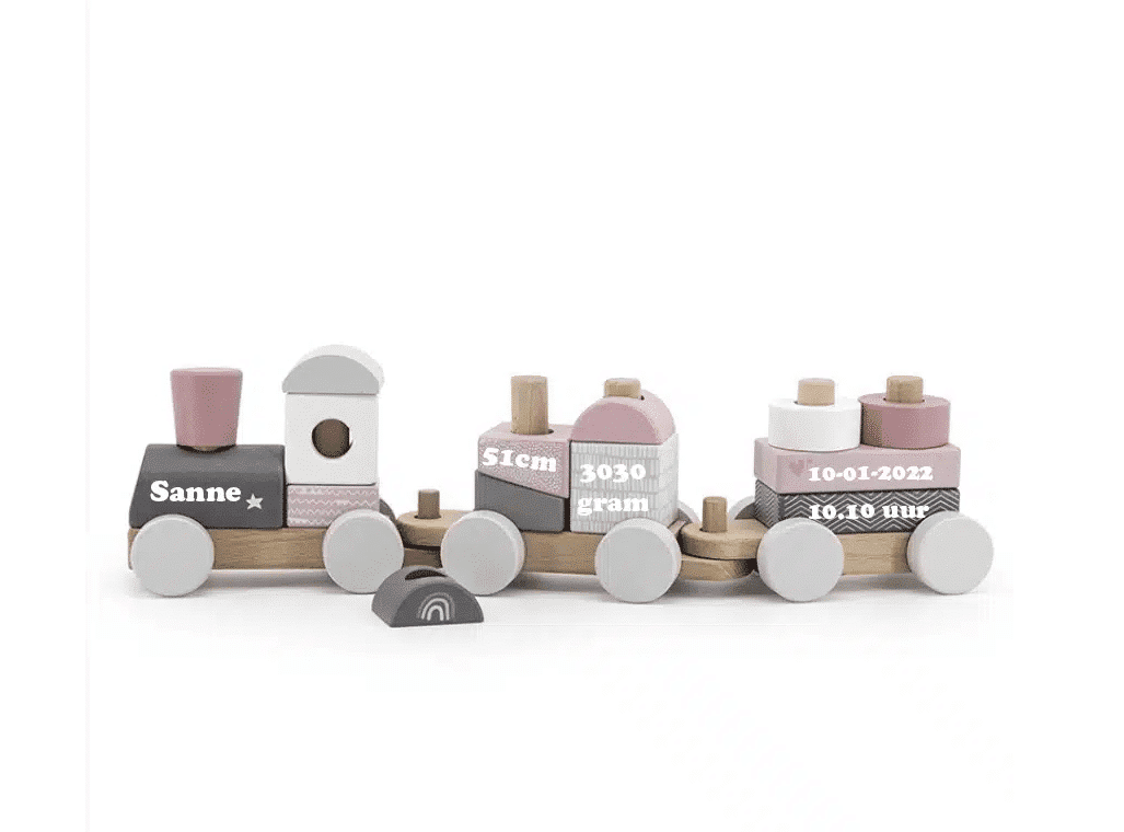 Laat de blokkentrein voorzien van de naam van het kindje. Extra opties zijn de geboortedatum, lengte, gewicht of tijdstip. Zo wordt het speelgoed echt uniek en een blijvende herinnering. - Kwaliteit en duurzaamheid