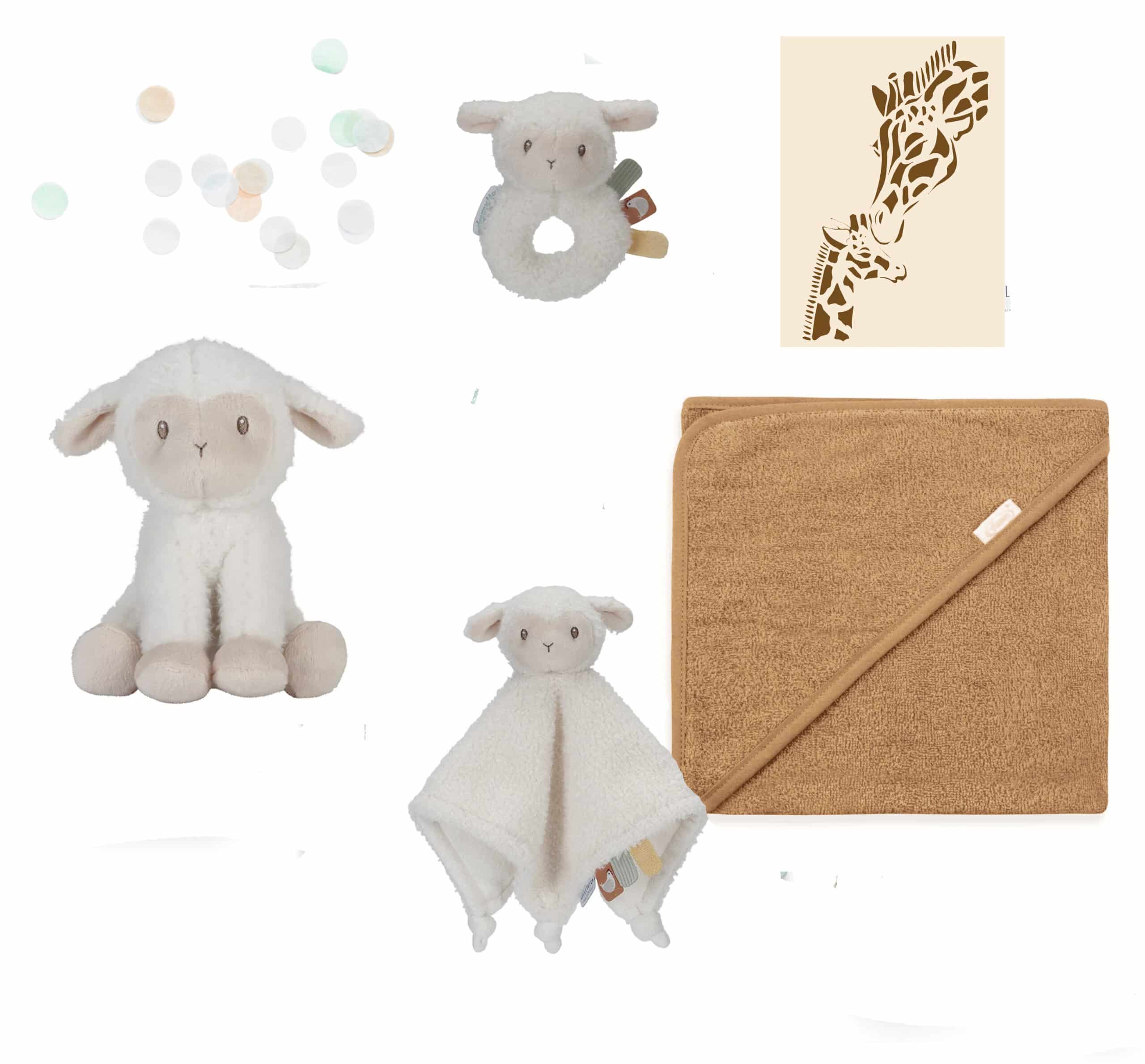 Het pakket Little Farm zit boordevol luxe producten! Een heerlijk zachte badcape in de warme kleur Sand. Met de bijpassende Schaapjes zoals, de rammelaar, knuffel en knuffeldoekje.