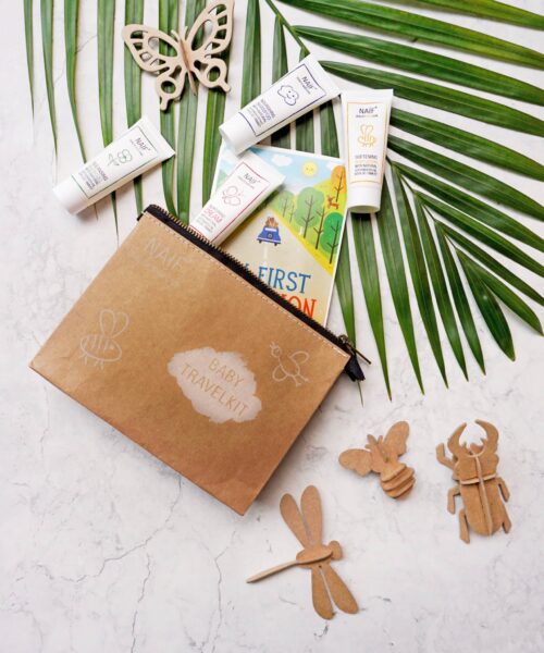 Ik ga op reis en neem mee… De Travel Kit! Ideaal voor op reis, vakantie of als je kroost uit logeren gaat. In de Naïf Travel Kit zitten vier handige producten, in reisformaat. Dus geen gezeur bij de douane. Ook fijn. Inclusief toilettas, gemaakt van recyclebaar karton. En we zijn nog niet klaar: je krijgt er ook een hydrofiele doek bij.