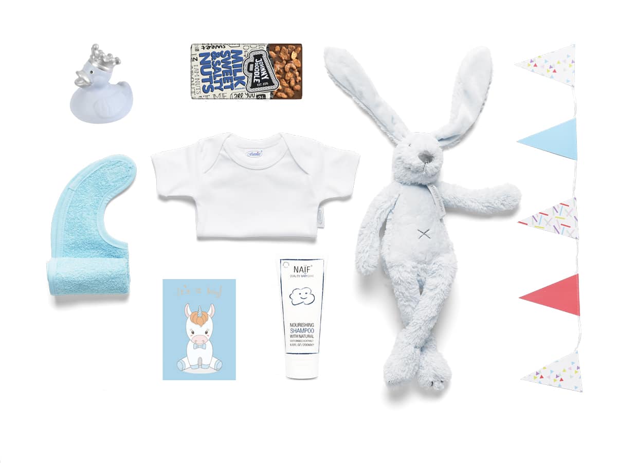 Lief kraamkado voor een pasgeboren baby jongentje! Het schattige konijn Richie zorgt voor uren knuffelplezier en grote kans dat dit zijn beste maatje zal worden. De box is verder gevuld met een romper en een slab, daar kun je niet genoeg van krijgen, een overheerlijke chocolade reep en een verzorgingsproduct van Naïf. Kortom het perfecte kraamcadeau voor de kersverse oudere
