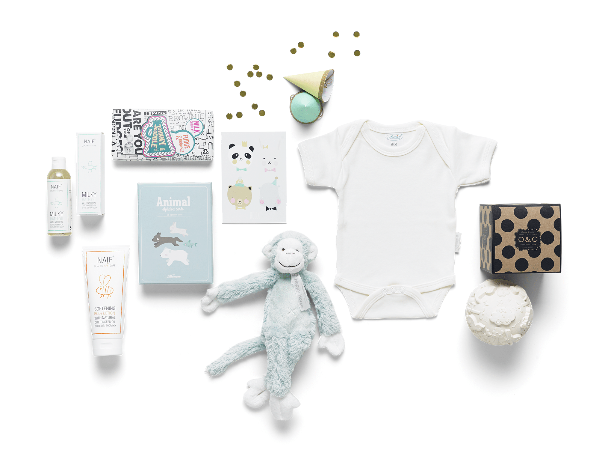 Nog een persoonlijk favoriet is het “Zoo” kraamcadeau! Een perfect cadeau anno 2021! Een verwenpakket voor zowel jongens als meisjes in de hippe trendkleur mint. Het knuffelaapje van Happy Horse is sowieso echt een absolute kindervriend! Dit luxe, goed gevulde kraamcadeau bevat ook twee fullsize Naïf producten. Namelijk de Milde badolie en de verzachtende bodylotion. Het bijt- en badspeeltje van Bambam Rubber Duck Ivory.
