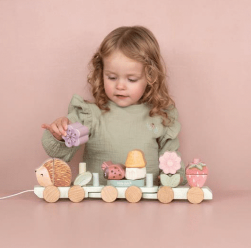 Choo choo! Verzamel alle lieve diertjes, bloemen en schatten uit Fairy Garden en spring aan boord voor een magische reis. Stapel de blokken één voor één op de drie wagons van deze houten stapeltrein. De egel neemt het voortouw en zit vooraan. Welke bloem volgt en waar zit het lieveheersbeestje? Elk blok vormt een stukje van het verhaal van jouw verbeelding. Een leuke manier om te spelen en tegelijkertijd de hand-oogcoördinatie te ontwikkelen. De trein bestaat uit 15 onderdelen en is ongeveer 45 cm lang.