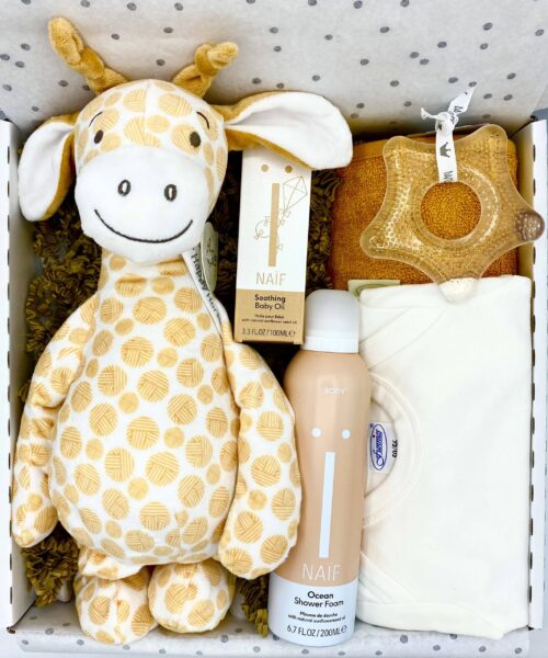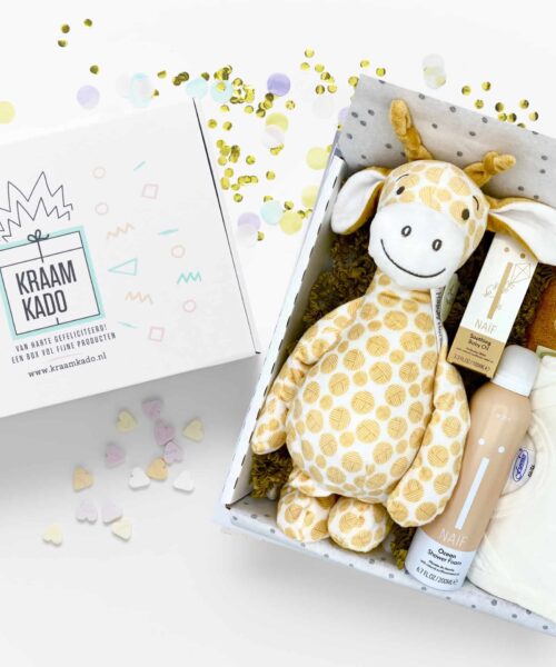 Deze schattige Giraf Gessy vergezelt je kleine wonder op de mooiste avonturen. Dit kraamcadeau bestaat uit uni producten in de ecru en een kleine touch oker. De badcape en de romper zijn gemaakt van de beste materialen! Uiteraard kunnen verse ouders niet genoeg rompers en badcapes krijgen! Verder zit er nog een heerlijke massage olie van Naif verzorgt en beschermt de tere babyhuid of de huid van de kersverse mama, voor een mooi ontspannen moment voor ouder en kind. Ook zit er een heerlijke shower foam in voor moeders.