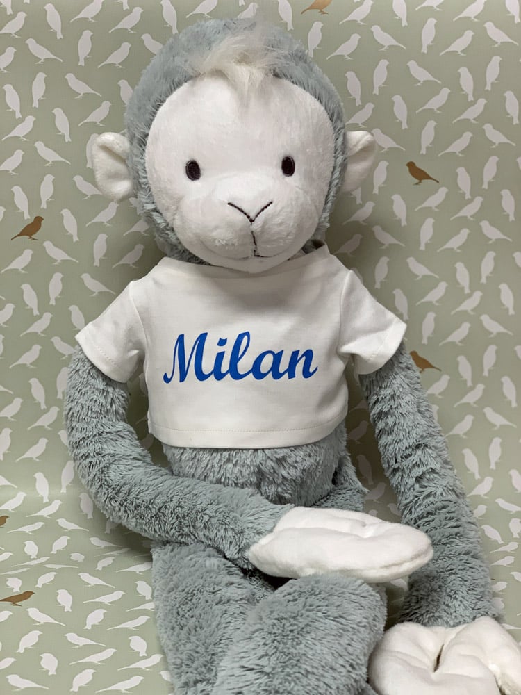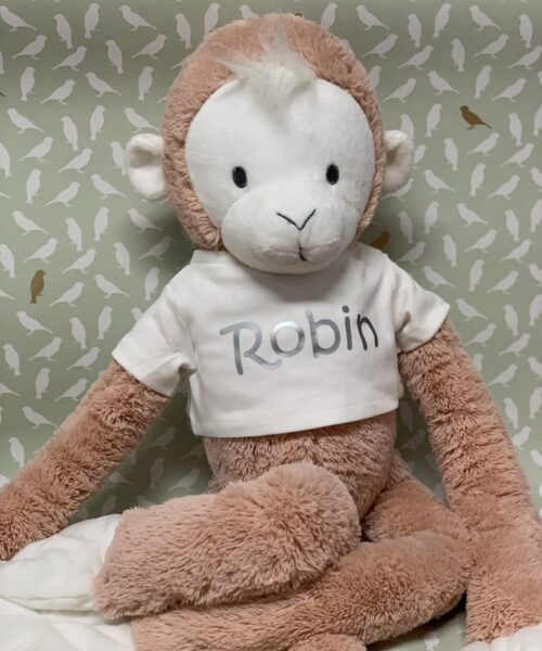 Hele grote knuffel aap met naam, deze aap krijgt een wit shirtje aan, waarop de naam kan.