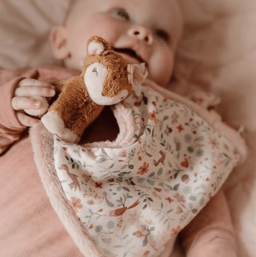 Knuffel maar fijn! Zorg ervoor dat dit heerlijk zachte knuffeldoekje altijd binnen handbereik is, voor geruststellende knuffels op elk gewenst moment, waar je ook bent. Versierd met het Fairy Garden dessin, biedt het vele leuke details voor baby’s om te ontdekken. Diverse labels die de zintuigen prikkelen, makkelijk vast te pakken knopen, en een lus om een speen of bijtring aan te bevestigen. Het zachte hertje maakt het doekje extra knuffelig.