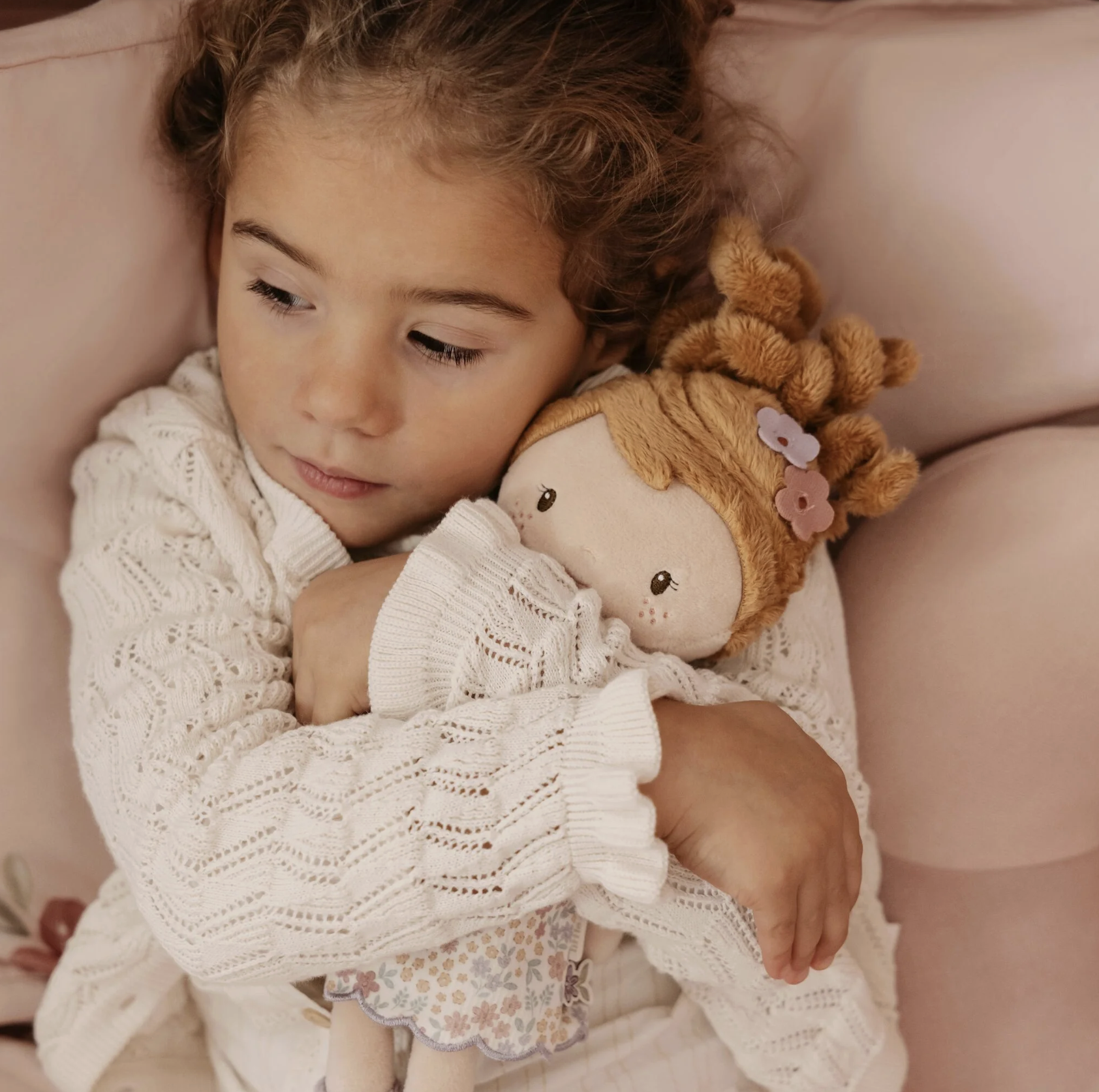 - Materiaal: Zacht pluche / textiel gekozen voor de zachtste materialen en met oog voor detail, zoals haar vrolijke bloemenjurk, laarsjes met pompom en krullen in haar haar