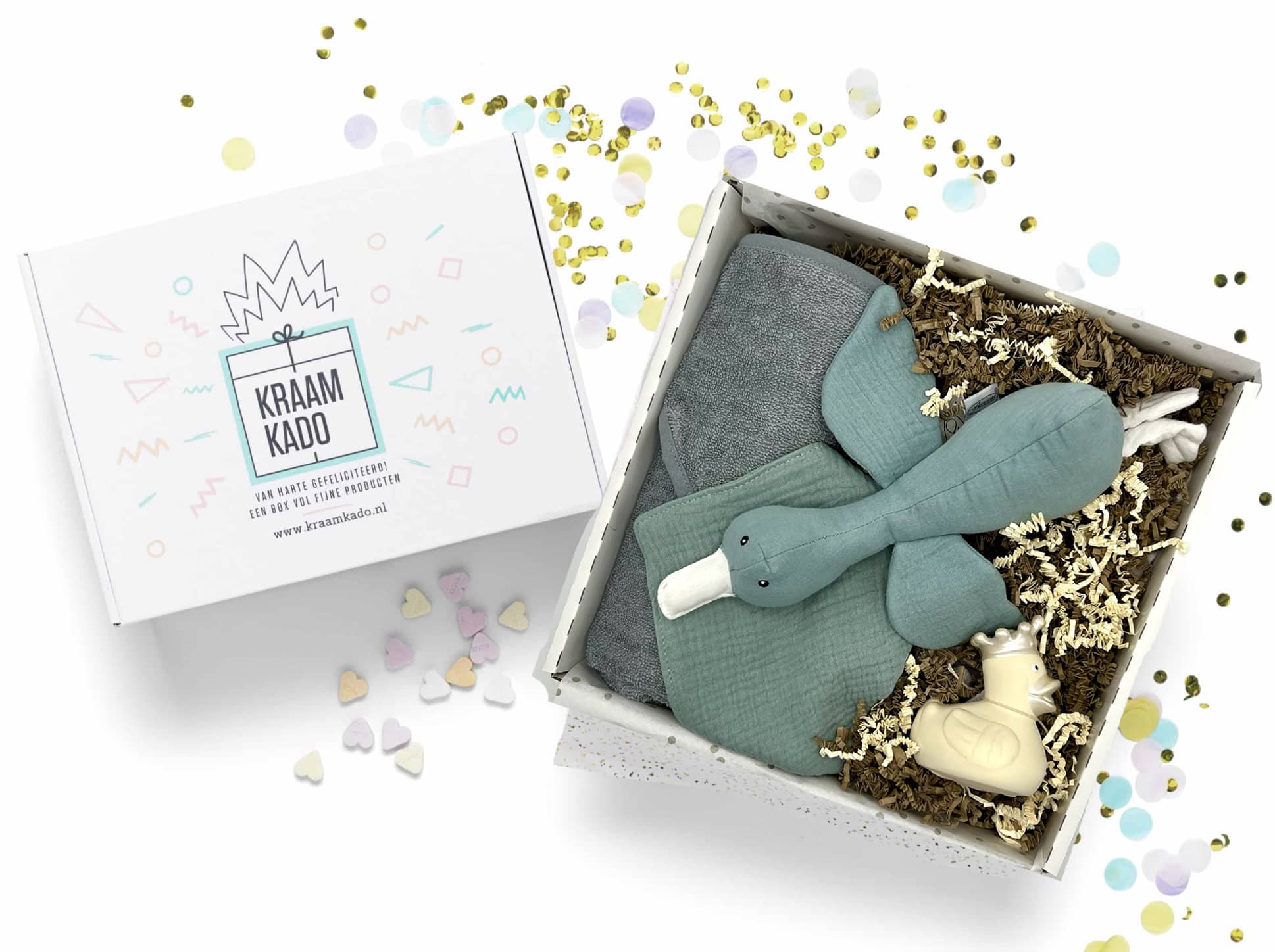 Het pakket Ducky Stone zit boordevol luxe producten! Een heerlijk zachte badcape in het grijs. Met een knuffel eend Stone Green met een prachtige matchende bandana slab En de kraambox maakt het af met de badeend Ducky