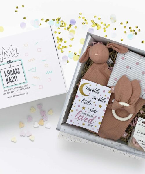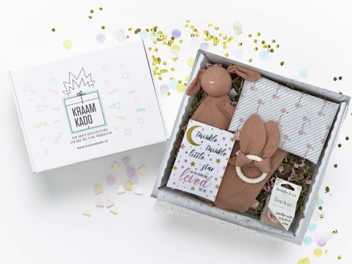 Het pakket cuddle, zit boordevol luxe producten! Een heerlijk zachte slab in het ecru. Het tutteltje konijntje is van Jollein en is aangevuld met een bijtring bunny ears. En een speen doddle en co. Deze handige speen plop je in en je kunt hem meenemen zonder dat hij vies wordt.