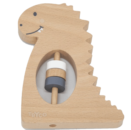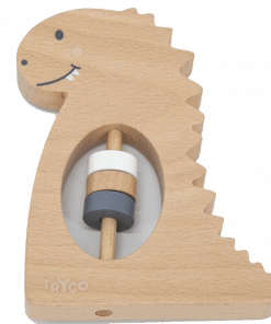Rammelaar van hout in de vorm van een Dino. De drie houten ringen maken een zacht tikkend en rammelend geluid.