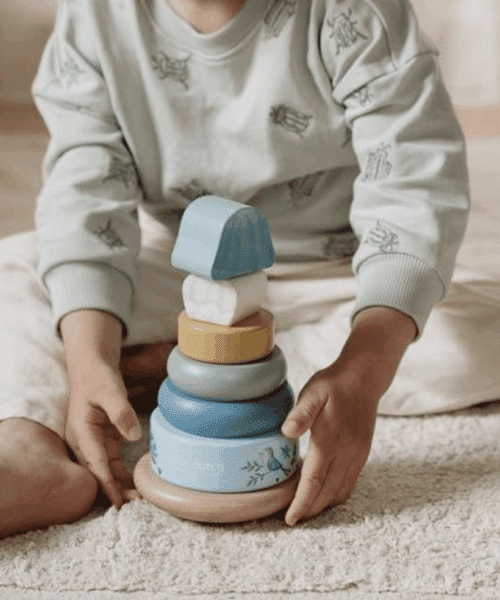 - Uniek ontwerp met “tuimelende” basis: de stapelringtoren wiebelt licht, wat het extra leuk én leerzaam maakt om de ringen in de juiste volgorde op te stapelen.